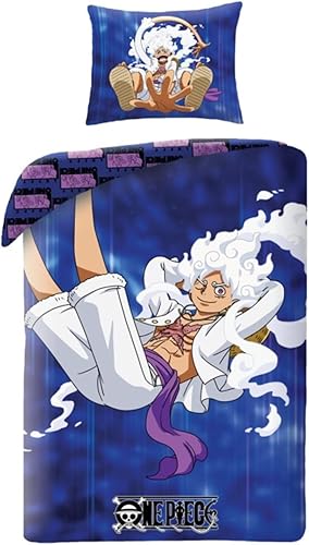 Halantex Parure de lit ONE PIECE Monkey D. Luffy GEAR5 - Housse de couette 140 x 200 cm avec taie d'oreiller 70 x 90 cm - 100 % coton Oeko-Tex - Bleu