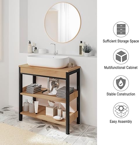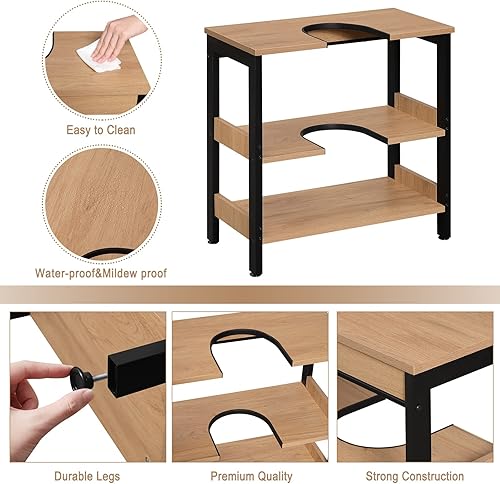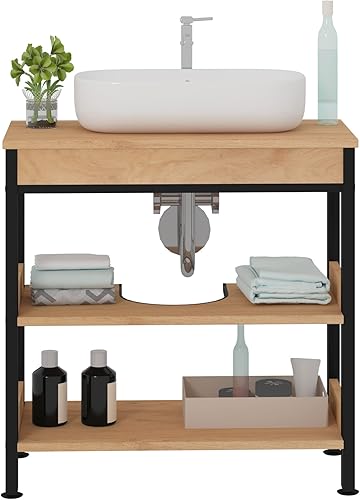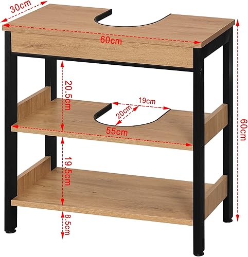 eSituro Meuble sous Lavabo de Salle de Bain à 3 Étagères sur Pied, Étagère de Rangement sous Vasque, Structure Métal - Bois Artificiel, Chêne Clair - Noir, 60x30x60 cm