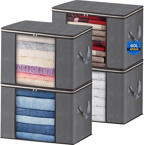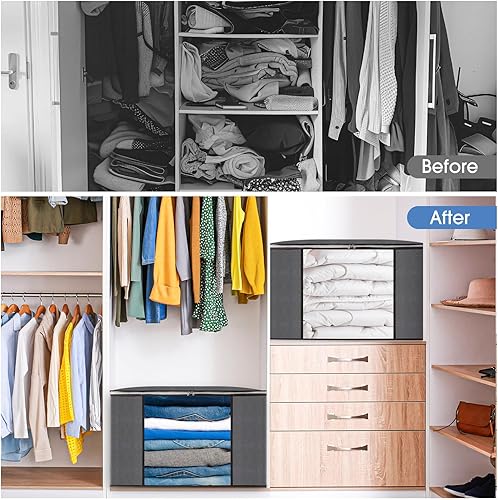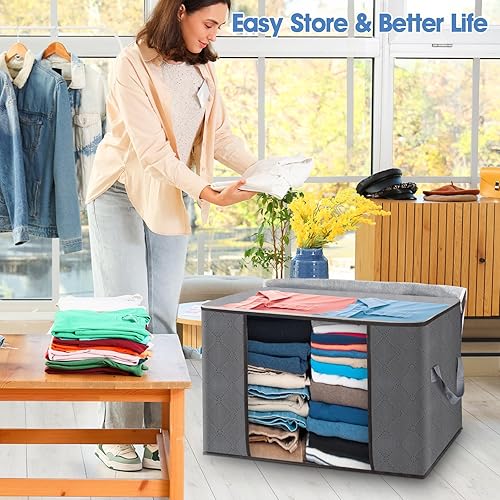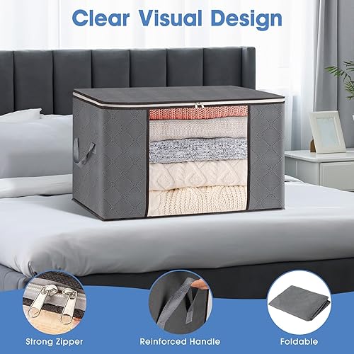 AIOR 3Pcs 60L Sac de Rangement Vetement Pliable avec FenêTre Transparente, Non-tissé Grande Boite Rangement Vetement pour Couettes, Couvertures Jouets VêTements, 55x35x32cm