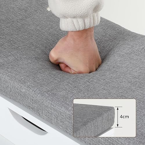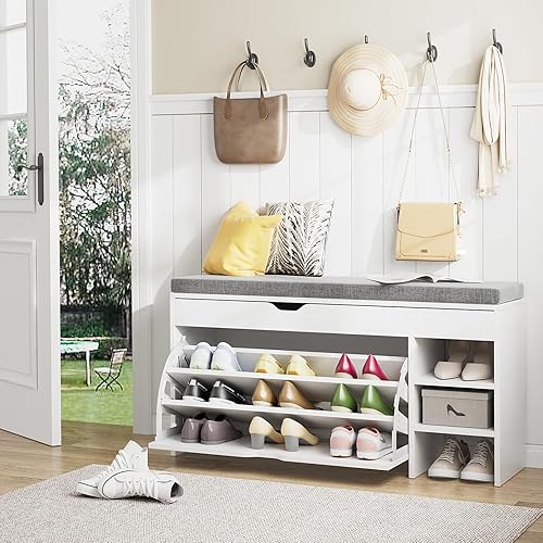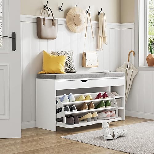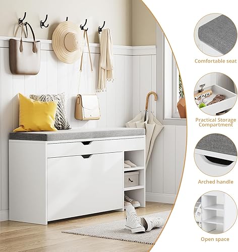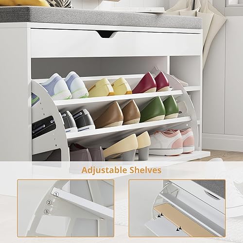VOWNER Meuble Chaussures, Banc de Rangement à Chaussures, avec Coussin Confortable, Meuble d'entrée Rangement pour Chaussures, 100 x 30 x 55 cm, Séparateurs Réglables, avec Tiroir (Blanc)