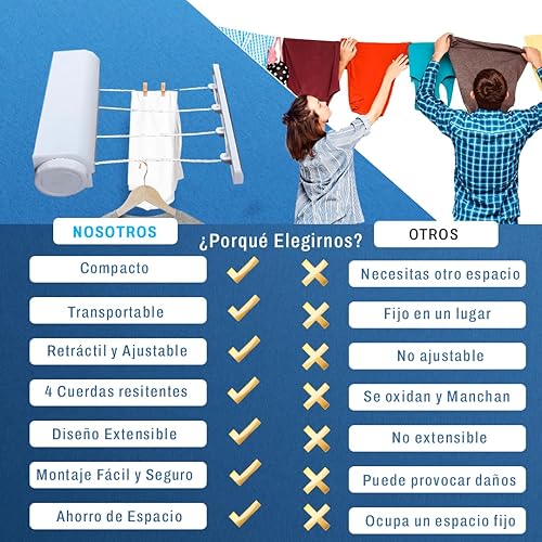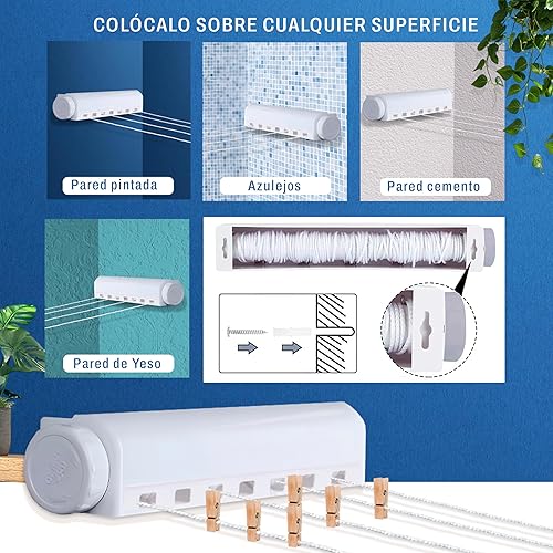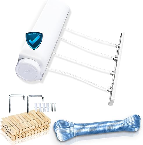 Pack étendoir extensible mural avec 4 cordes de 3,2 m chacune, 24 pinces et 20 m de corde extra renforcée en fil d'acier 3 mm, étendoir rétractable, corde à linge extensible, avec carte QR