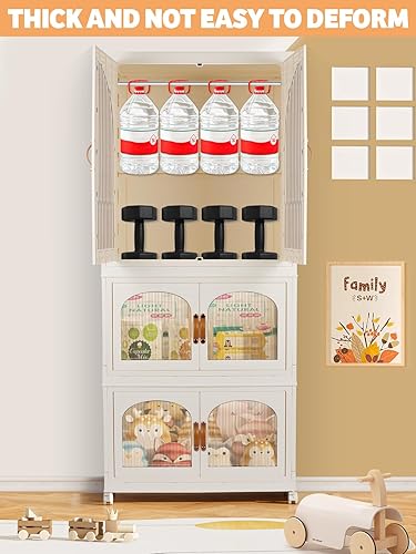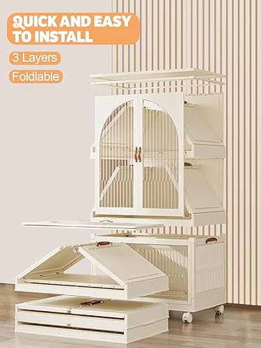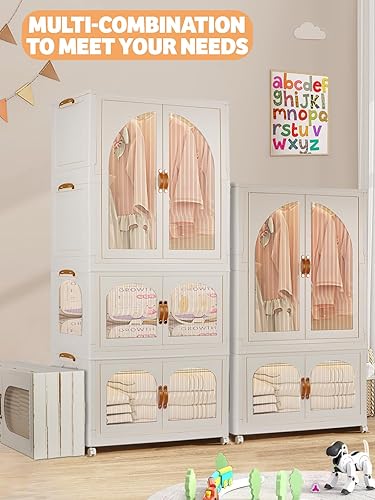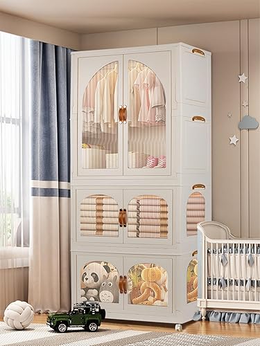 Kalolary Armoire Portable, 3 Étages Armoire Etagères Plastiques Enfants Boîte de Rangement Pliable Organisateur de Rangement Plastique avec Couvercle et Poulie pour Chambre d'enfant