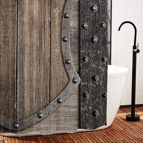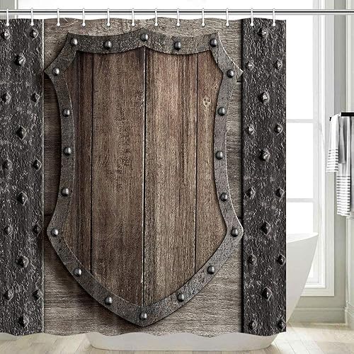DYNH Rideau de douche médiéval, bouclier en bois sur porte de château médiéval, rideau de bain en tissu polyester avec 12 crochets, 177,8 x 178,8 cm