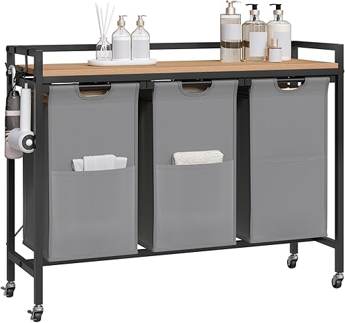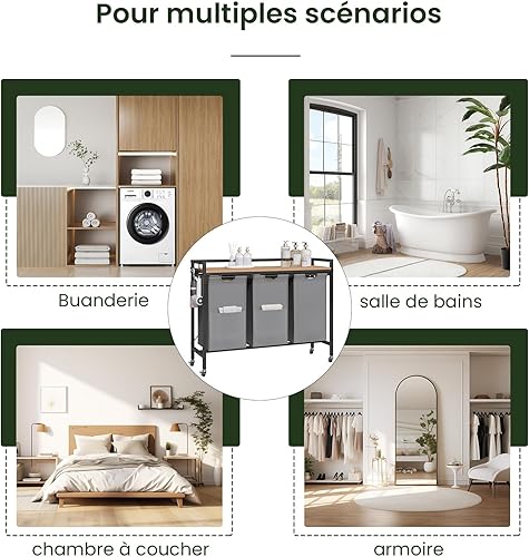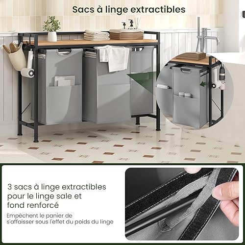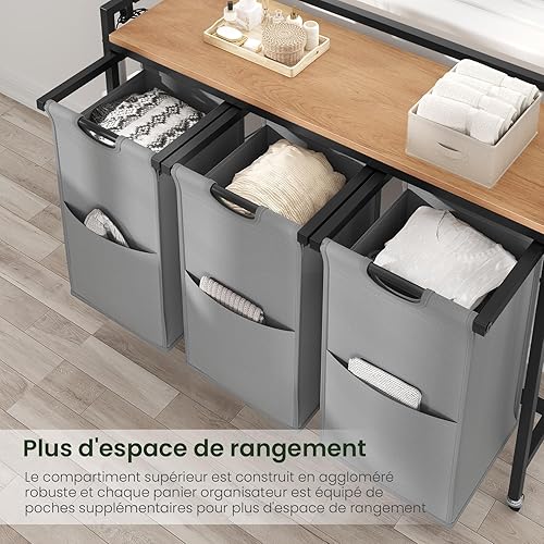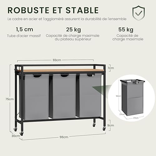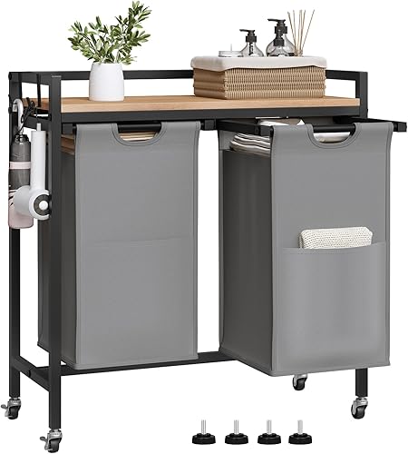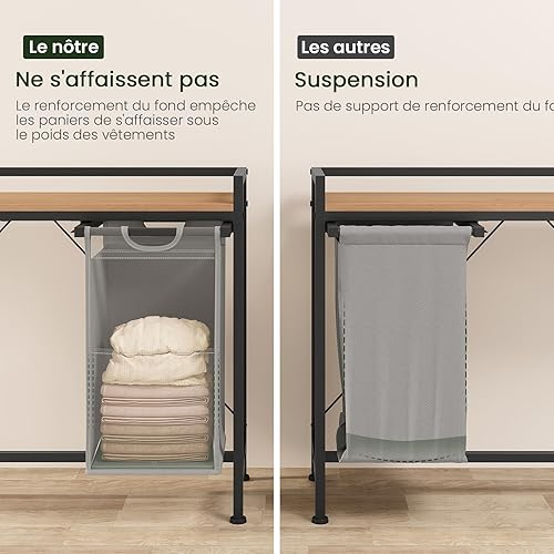 EUGAD Panier à Linge à 2 Compartiment, Meuble Panier à Linge, 40L/Panier, Chariot à Linge sur Roulettes, Corbeille à Linge Amovible et Extensible, en Oxford, 70x30x71cm, Chêne Clair+Noir