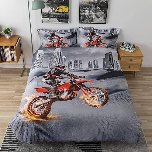 KKPW Housse de Couette Moto Grise,Housse Couette 140x200cm+ 2 Taies d'oreiller 65x65m Parure de Lit, Housse de Couette Fermeture éclair