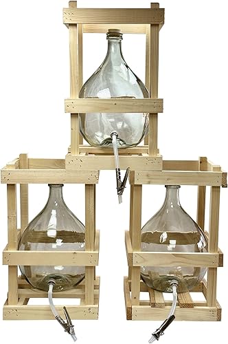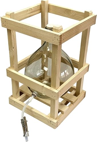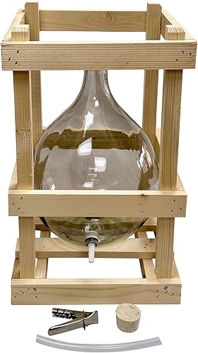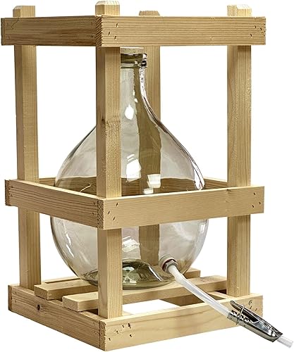 Bonbonne en verre 10 L dans un support en bois, avec accessoires