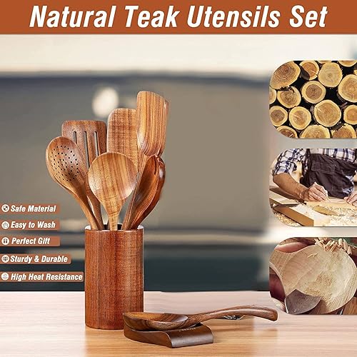 REHOC Lot de 9 cuillères en bois pour la cuisine, ustensiles en bois pour la cuisine avec support d'ustensiles, ensemble d'ustensiles de cuisine en bois de teck