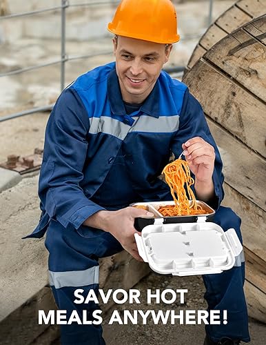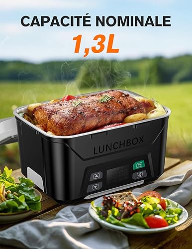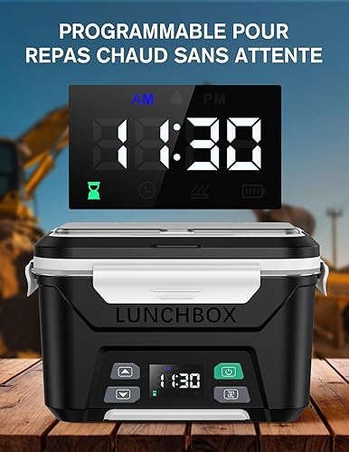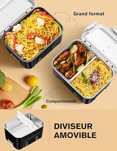 Docusvect Gamelle Chauffante avec Batterie, Lunch box Chauffante avec Chauffage Programmable, Lunch Box Adulte de 1,3 L, Boite Chauffante Repas à Séparateurs Amovibles, Couverts et Sac Isotherme