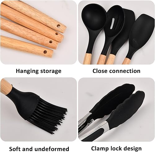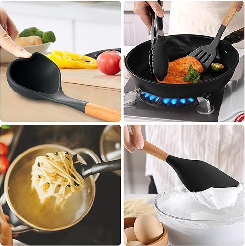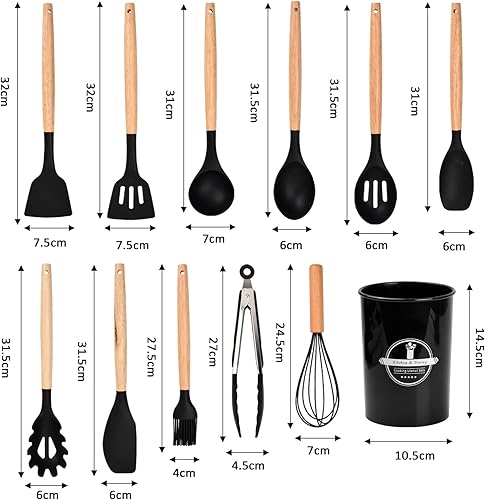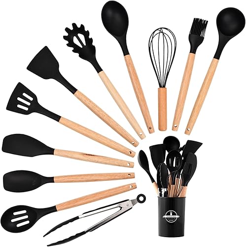 Litinliv Set 12PCS Ustensiles de Cuisine en Silicone Noir - Antiadhésifs, Anti-Rayures & Résistants à la Chaleur, Incluant Cuillères, Spatules & Gadgets, Idéal pour Batterie de Cuisine