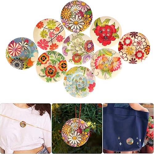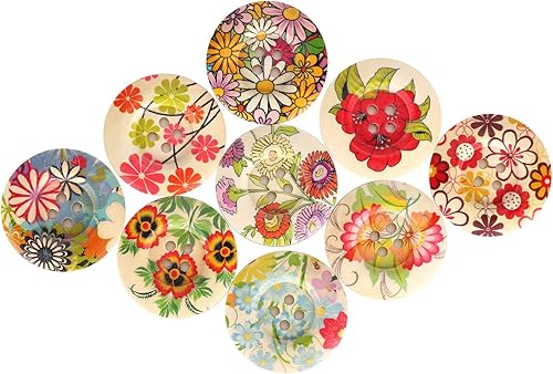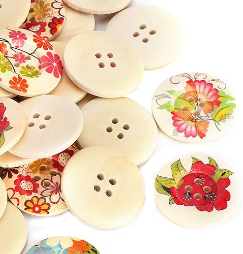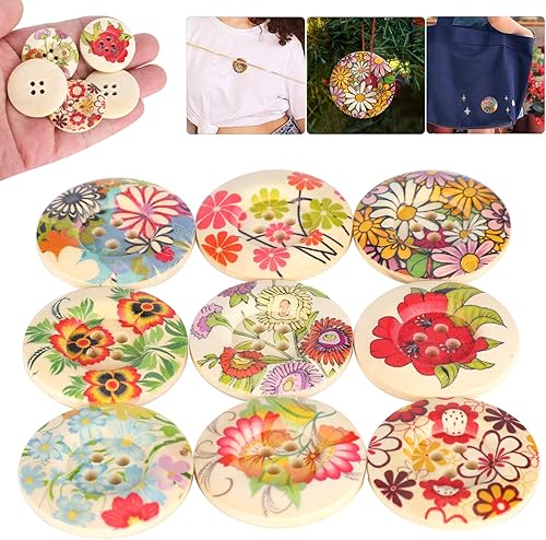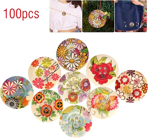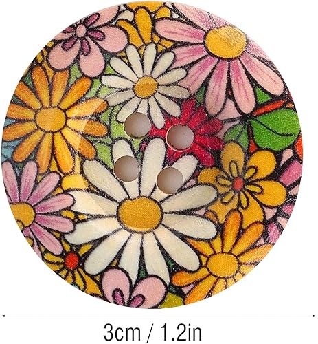 100 pcs Grands Boutons en Bois, 3 cm Boutons en Bois Colorés avec 2 Trous Motif Fleurs Boutons Décoratifs Ronds pour Bricolage Couture Artisanat Vêtements Accessoires Boutons de