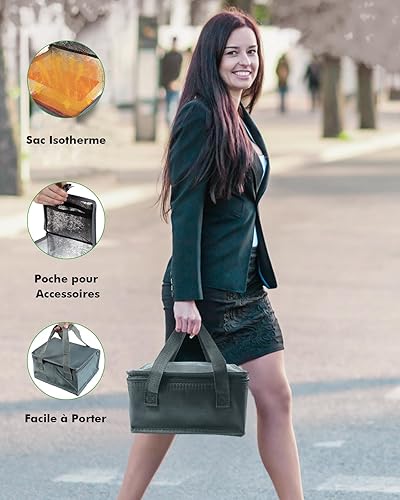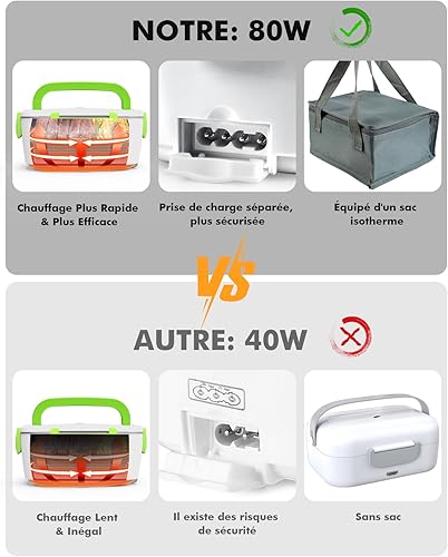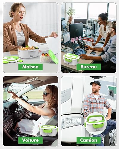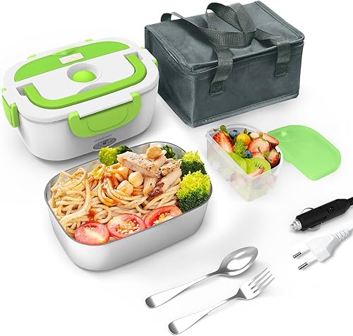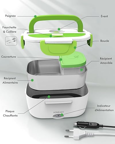 homeasy Gamelle Chauffante Rapide 80W, Lunch Box Chauffante 220V 24V 12V Boîte Repas Amovible Acier Inoxydable 1,5L avec Sac Isotherme, Hermétique pour Voiture, Camion, Bureau, Camping Vert