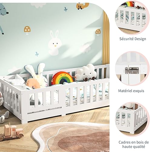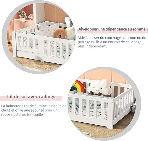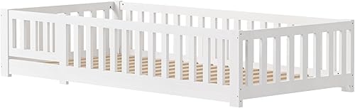 LONELYO Lit Enfant 90x190 cm - Lit au Sol Enfant en Bois Naturel avec Barrière et Sommier - Charge jusqu'à 230 kg - Lits Montessori pour Garçons et Filles