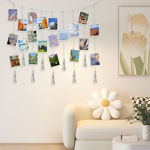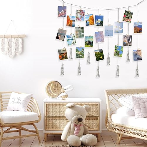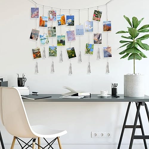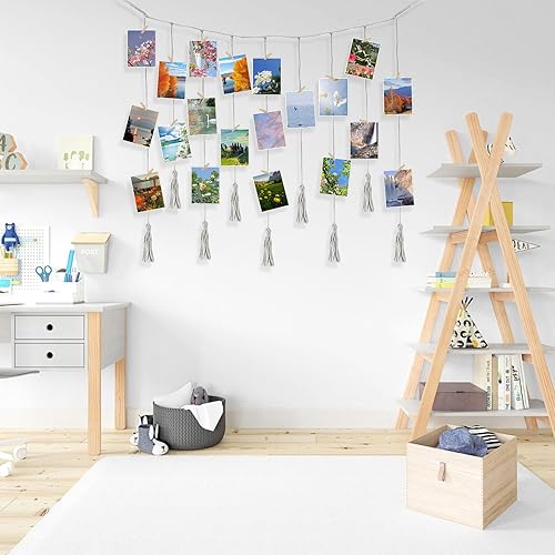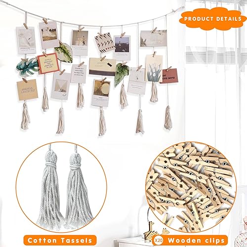 anyìshwu Présentoir Photo à Suspendre,Porte Photo Mural,Accroche Photo,9 cordes + 20 clips en bois,pour Decoration Maison Accroche Photo Mural