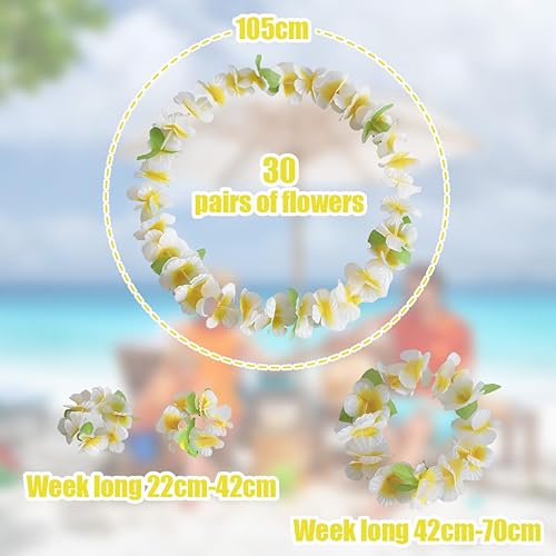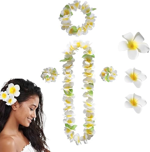 AUEFUDQ Luau Lot de 7 chaînes de fleurs décoratives avec collier, bandeau, bracelet, pinces à cheveux, guirlande de fleurs pour fête hawaïenne, plage, mariage, blanc