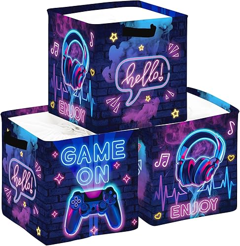 HUUMONSS Boîtes de Rangement Lot de 3 Panneau Néon Gamer Paniers de Rangement Cube Contrôleur de Jeu Casque LED Enfant Pliables Coffre à Jouets Garçons Filles pour Étagères Livres,Colorée,30x30x30 cm