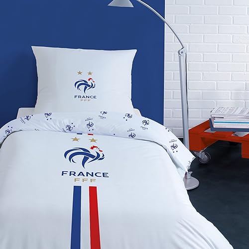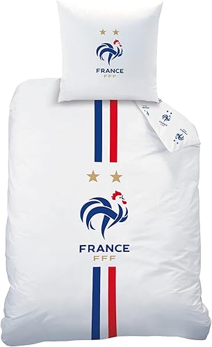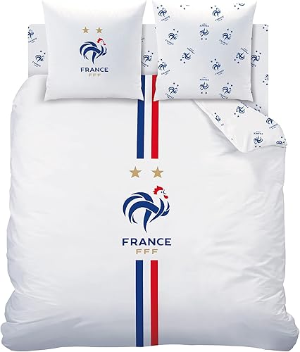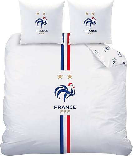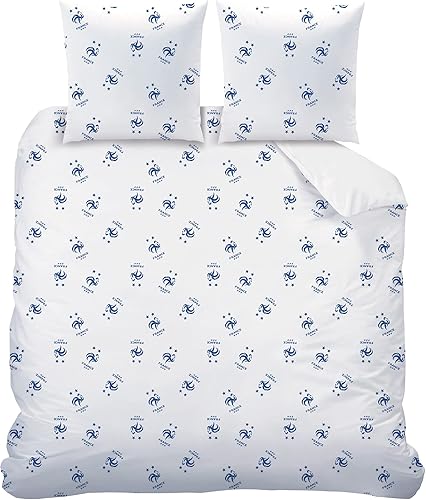 FFF EQUIPE DE FRANCE Parure de Lit 1 ou 2 Personnes |100% Coton | OEKO-TEX | Housse de Couette 220x240 cm + 2 Taies d'Oreiller 63x63 cm | Imprimé Réversible football | Blanc