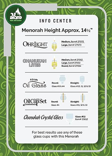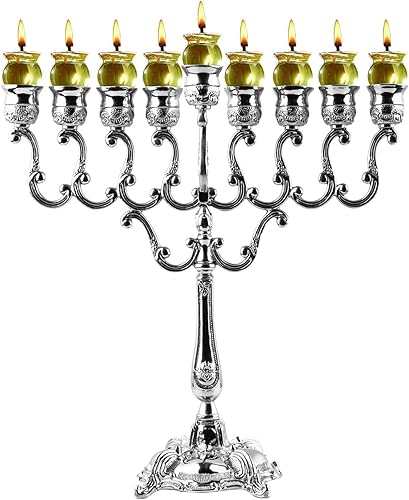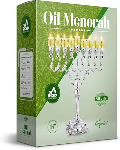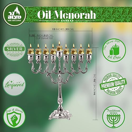Menorah Hanouka Plaqué Argent pour l'huile - Hanukkah Menorah Convient Aux Tasses à Huile Hanukkah Standard et Aux Grandes Bougies - 35 cm de Haut - Branches D'olivier