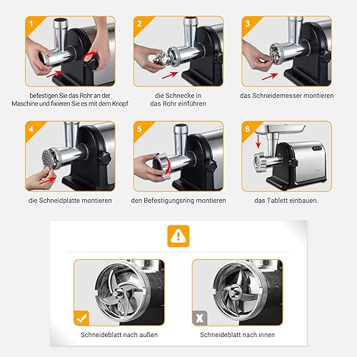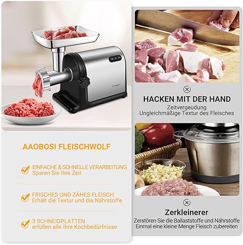 Aobosi Hachoir a Viande électrique 3000 W Professionnel avec 3 tailles de grille de hachage, Tube de hachoir #10, Inox, pour saucisse