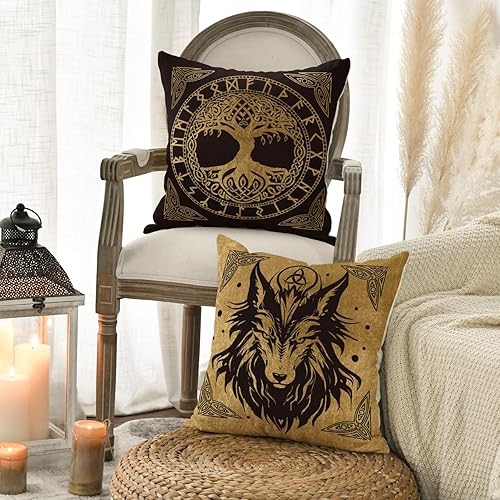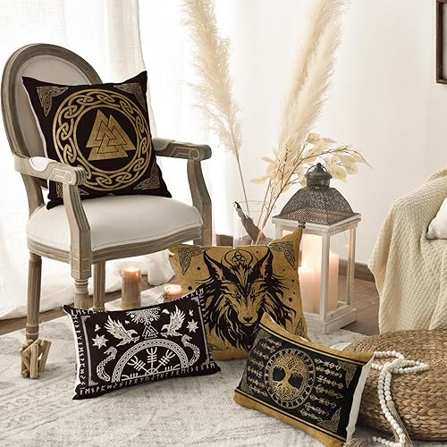 Artoid Mode Lot de 4 housses de coussin Viking Futhark Runes Odin Arbre de vie 45 x 45 cm Décoration pour canapé, salon