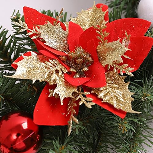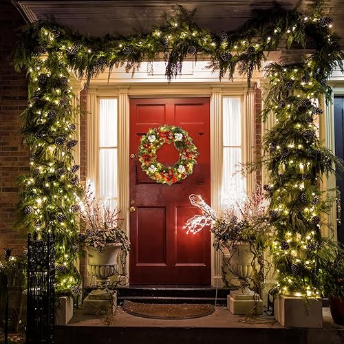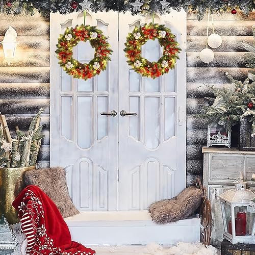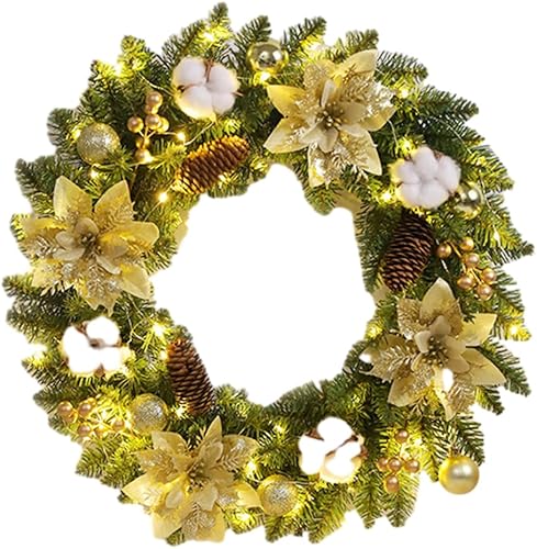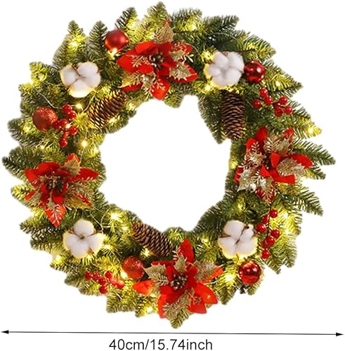 Starnearby Couronne de Noël Porte Artificielle avec Pommes de Pin et Poinsettia, Couronne de Noel Lumineuse LED, Guirlande de Noël, Couronne Noel Porte Lumineuse, Décoration de Noël 40CM