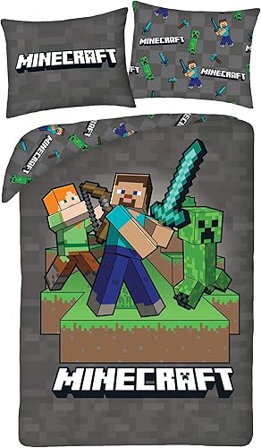 MINECRAFT Parure de lit STEVE ALEX CREEPER – Housse de couette réversible 140 x 200 cm + 1 taie d'oreiller 70 x 90 cm – 100 % polyester excellente qualité – Multicolore