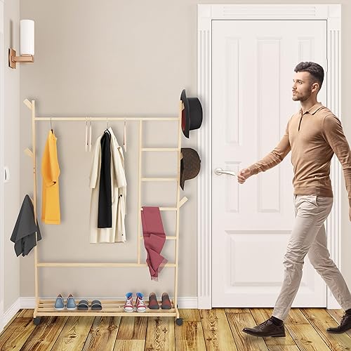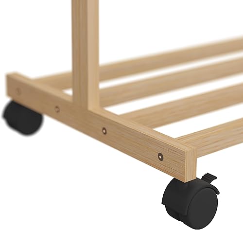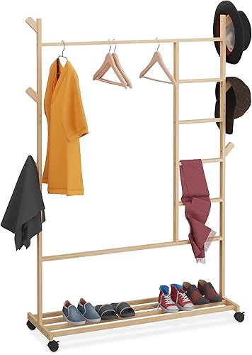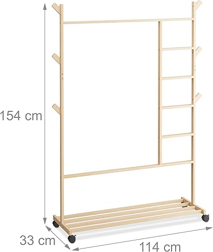 Relaxdays Portemanteau sur roulettes, en Bambou, 6 Crochets, H x L x P : 154 x 114 x 33 cm, Nature