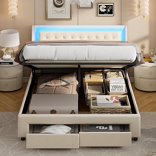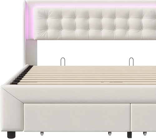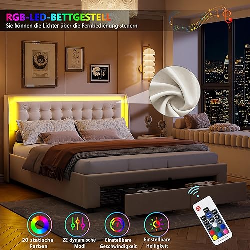 KRYZOR Lit Coffre 180 x 200 avec LED, Lit Double rembourré avec 2 tiroirs, Lits 2 Personnes, Cadre de Lits avec sommier à Lattes, pour Adultes et Adolescents, Velours (180x200 cm)
