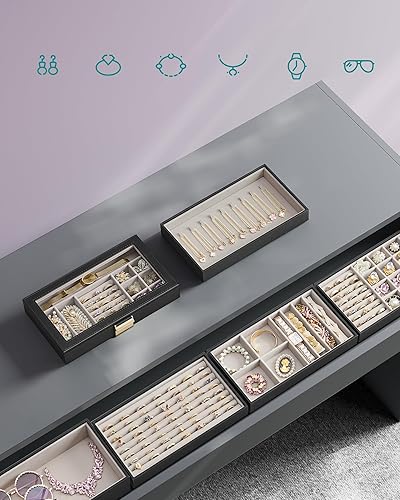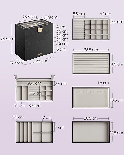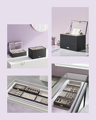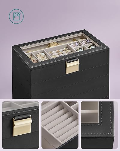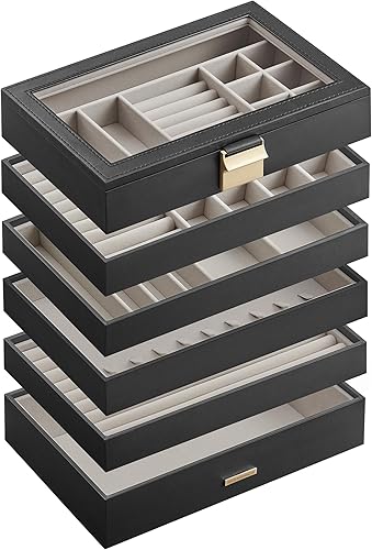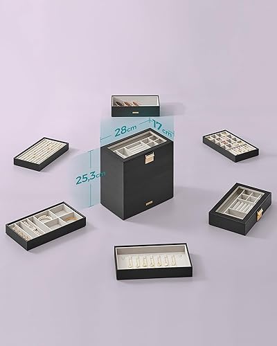 SONGMICS JBC195B01 - Plateau à bijoux empilable - 6 niveaux - Grande boîte à bijoux - Couvercle en verre transparent - 17 x 28 x 25,3 cm - Pour coiffeuse - Idée cadeau - Noir encre