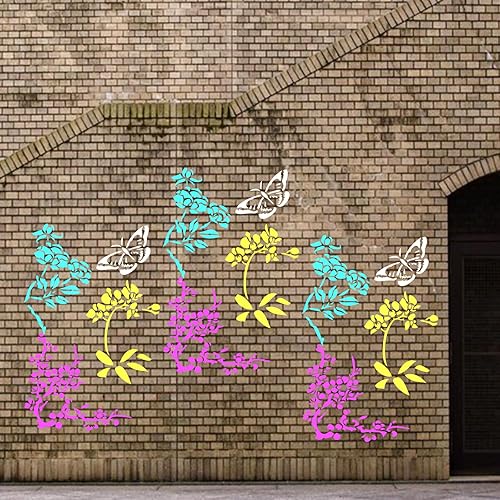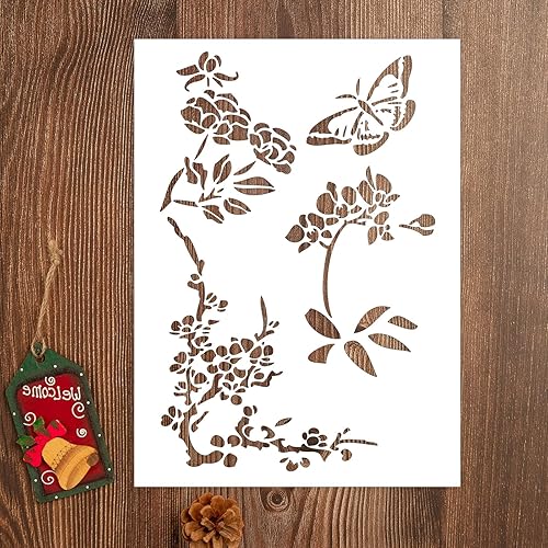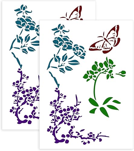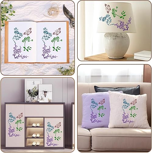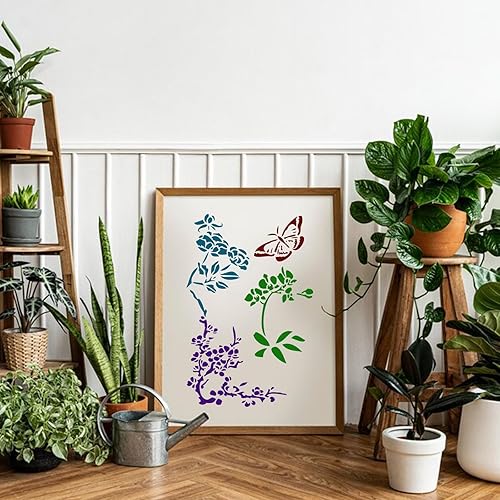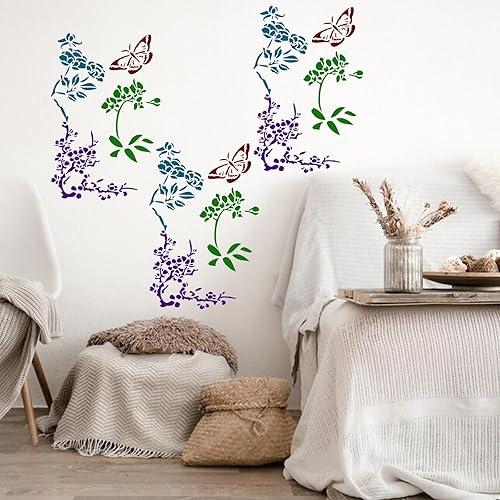GEEHUA Lot de 2 grands pochoirs de peinture murale réutilisables de taille A4 - Motif : branches et papillons - Pour peinture sur bois, murs, toile, tissu
