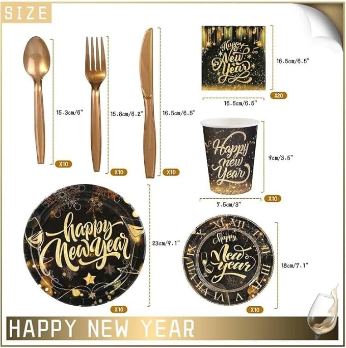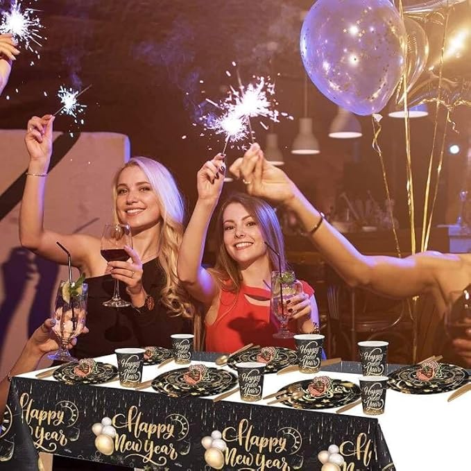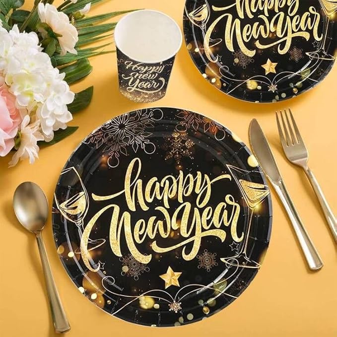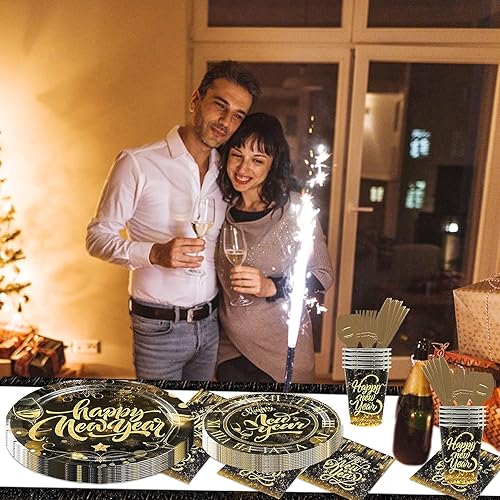 81 pièces Nouvel An ensemble de vaisselle de nouvel an en or noir vaisselle de nouvel an assiette de nouvel an serviette tasse pour la décoration 2025 nouvel an Night Party Supplies 2025