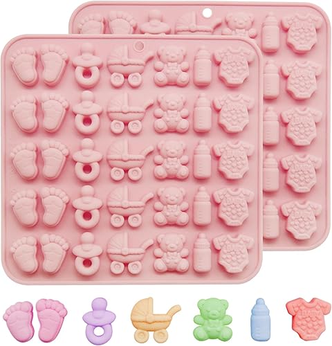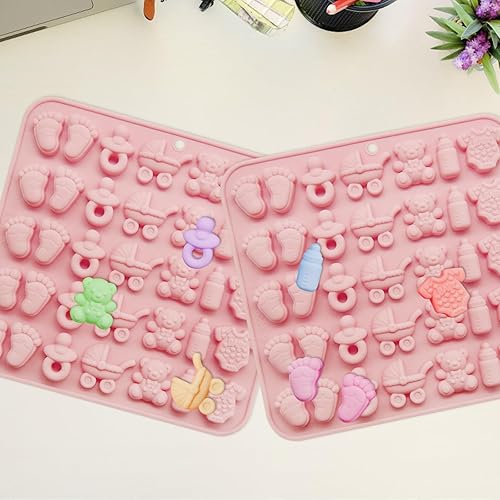 Lot de 2 moules à chocolat antiadhésifs en silicone pour baby shower, adorables chaussons, empreintes de pieds, biberons, tétines, cupcakes, décorations pour gâteaux, bonbons, bonbons, etc.