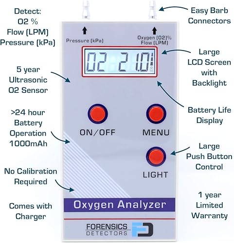 Oxygen Analyzer by Forensics | 21%-100% | O2, Flow & Pressure Digital Readout |