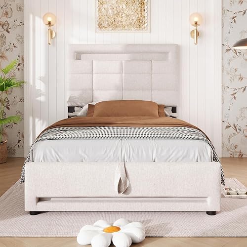 Seyakany Lit rembourré 90x200cm,Lit Coffre 90x200 avec lumières LED et Port USB,Cadres de lit avect élécommande APP et hydraulique Rangement,sans Matelas,Tissu de Lin,pour Enfants et Adultes,Beige