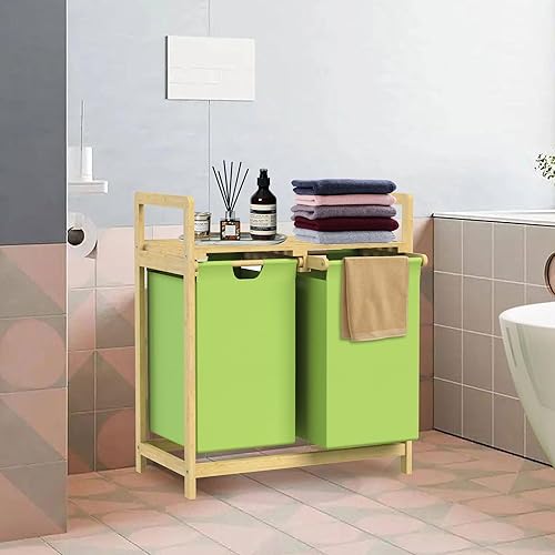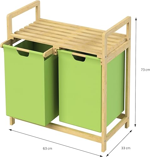 ML-Design Panier à Linge en Bambou, Vert, Collecteur de Linge avec 2 Sacs à Linge Extensibles 60 L, Rangement Buanderie, LxlxH: 63x33x73 cm, Coffre avec Etagère pour Salle de Bain, Chambre, Dortoir