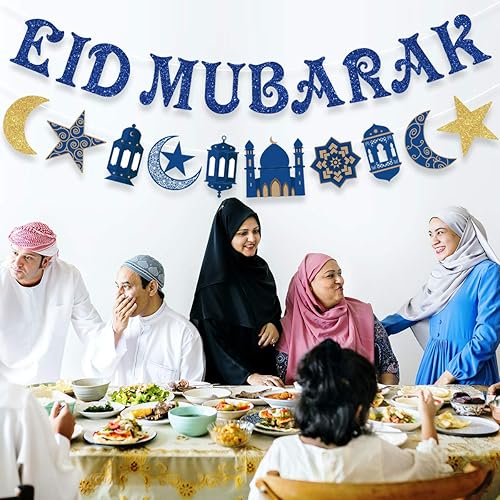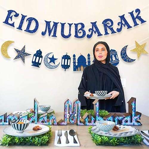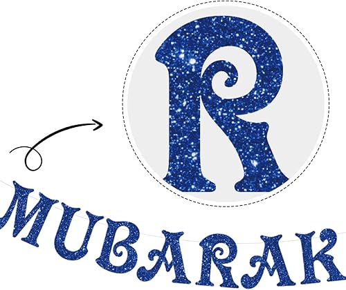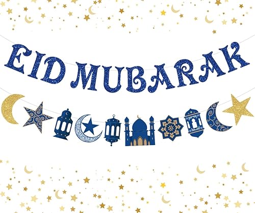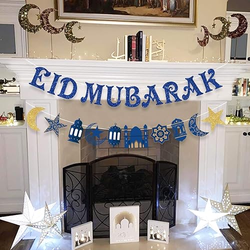 Eid Mubarak Banner, Eid Mubarak Decorations Eid Mubarak Bunting Garland Blue Glitter, Ramadan Hajj Mubarak Kareem Decorations for Home Office Muslim Islamic Party Supplies