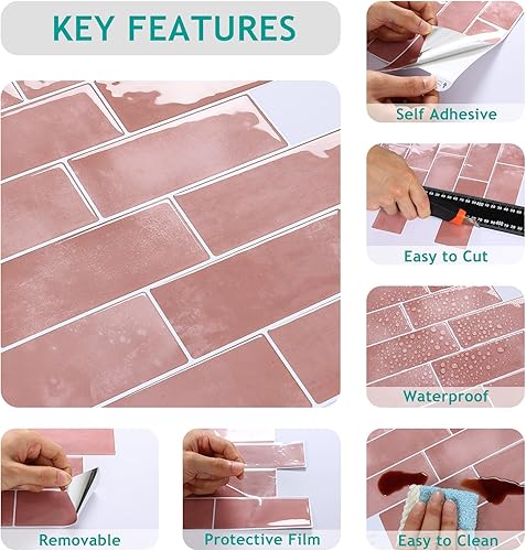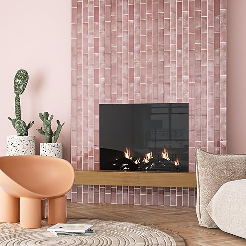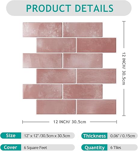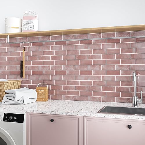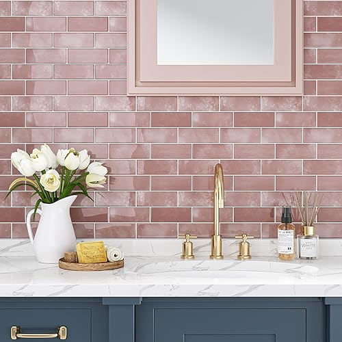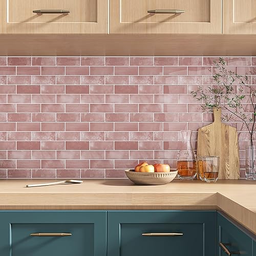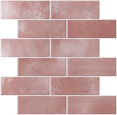 VEELIKE Carreaux Adhesif Cuisine Rectangles Rose Carrelage Adhesif Mural Salle de Bain Stickers Carrelage Cuisine Credence Adhesif Mural Dalles PVC Autocollantes Toilette 30.5cm×30.5cm 24 Pièces