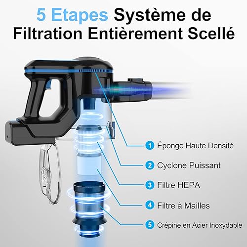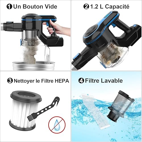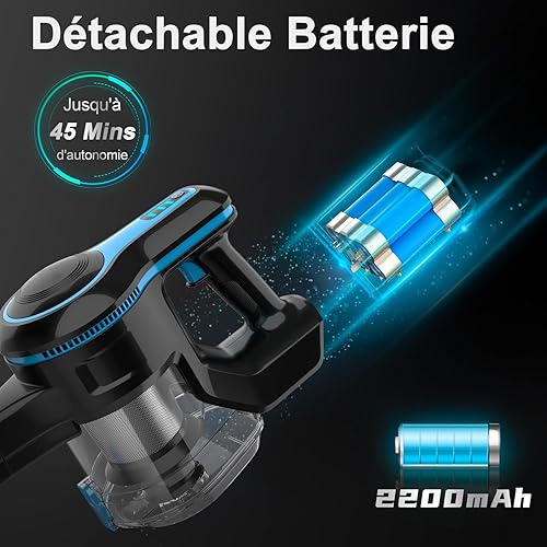 Aspirateur sans Fil, Aspirateur Balai sans Fil Puissant, 45Min Autonomie, Batterie Amovible Rechargeable, Capacité 1.2L, 6 en 1 Aspirateur sans Sac Léger pour Poils Animaux Sol Dur Tapis Voiture