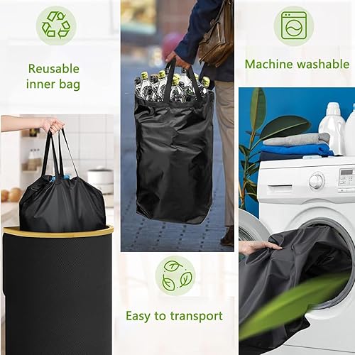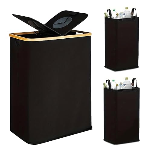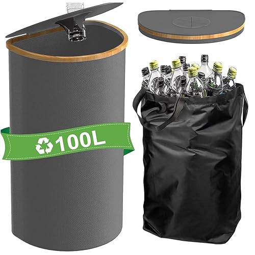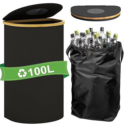 Xummi Collecteur de bouteilles consignées 140 l, 2 compartiments avec trou, couvercle et 2 sacs de transport, grandes bouteilles de consigne, rangement pour les produits vides et le verre usagé, noir