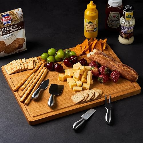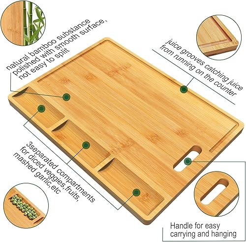 Planche a Decouper Bois, Naturelle Planche a Decouper Bambou, Planche à Découper Bois avec 3 Compartiments Intégrés et Rainures