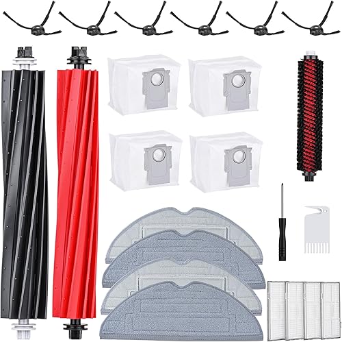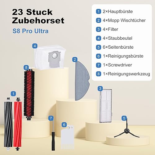 Lot de 23 accessoires pour Roborock S8 Pro Ultra comprenant 2 brosses principales, 6 brosses latérales, 4 filtres HEPA, 4 chiffons de nettoyage pour serpillère, 4 sacs à poussière, 1 brosse de