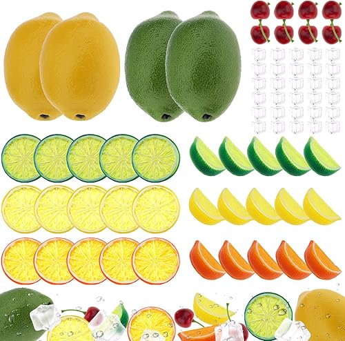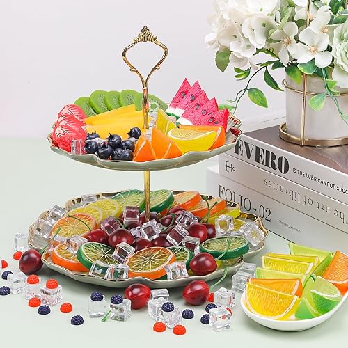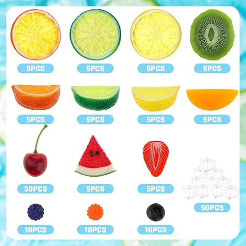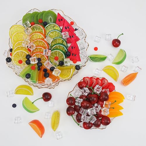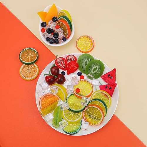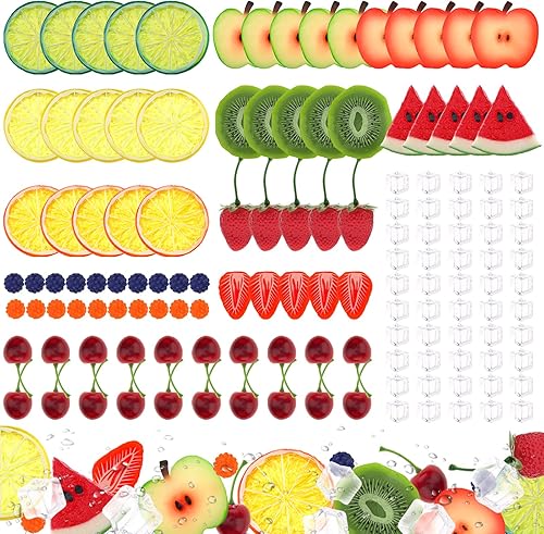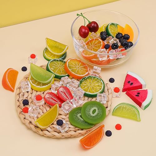 Gresorth Lot de 160 tranches de kiwi artificielles, jaune, pêche, citron, décoration, faux bloc de pastèque, fraise, framboise, myrtille, cerise, glaçons, présentoir