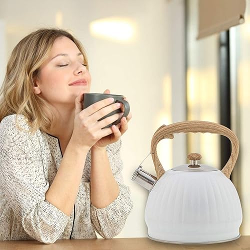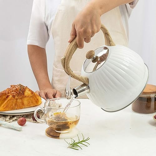Bouilloire Théière Sifflante Rétro, Bouilloire Sifflante pour la Cuisinière à Gaz Grande Capacité 3.5L Forme de Citrouille Poignée en Bois-Blanc 19,5 * 22,5 cm