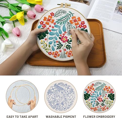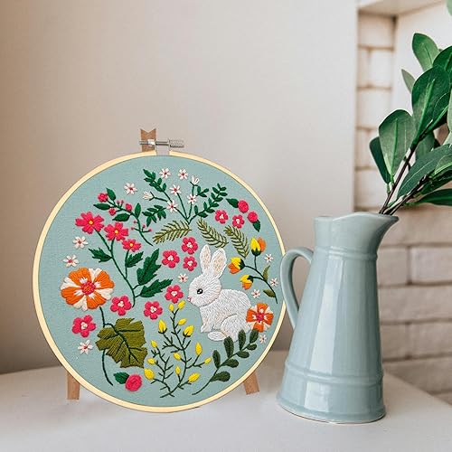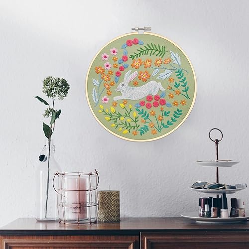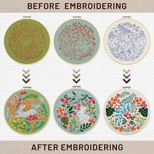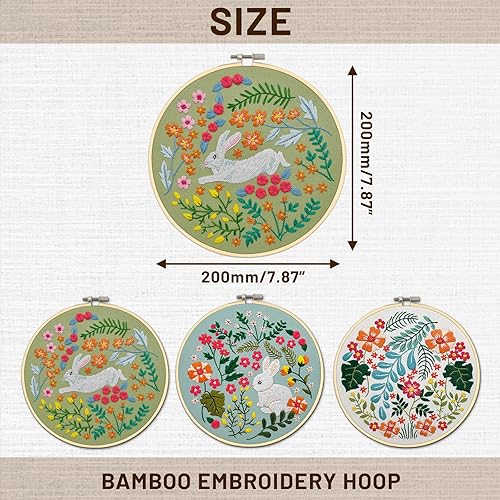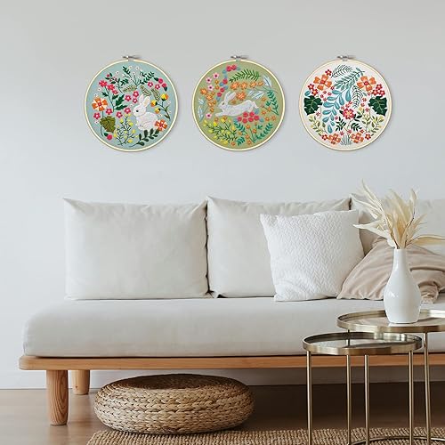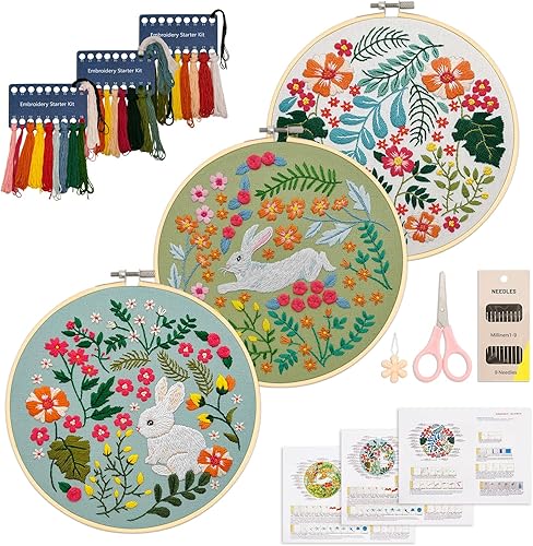 XM-GENYUE 3PCS Kit de Démarrage de Broderie, 1 Cerceau de Broderie, 3 Tissus à Broder avec Motifs Lapin, Fils, Aiguilles et Dessins Pré-imprimés, Point de Croix, Artisanat DIY