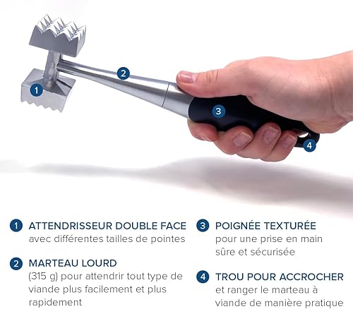Joeji's Attendrisseur de Viande en métal - Prise en main Durable et Confortable - Double Face - Marteau à Viande idéal pour le boeuf, la volaille, le porc et le poisson