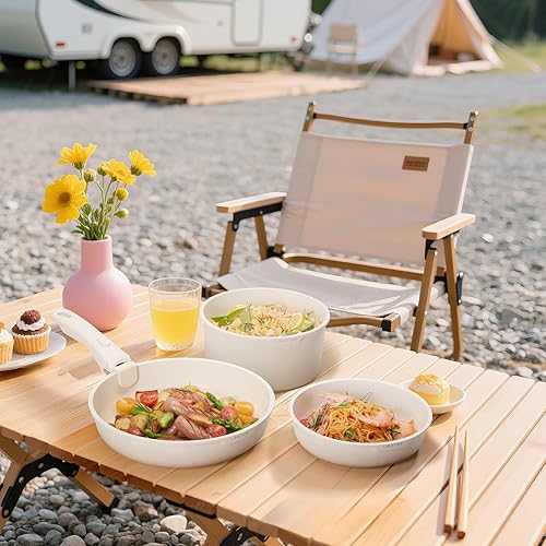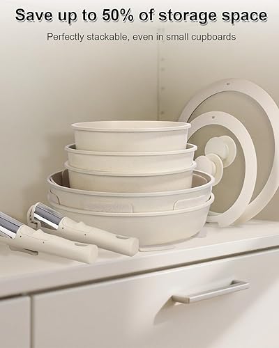 JEETEE Ensemble de casseroles et poêles antiadhésives 19 pièces, ensemble d'ustensiles de cuisine avec poignée amovible, ensemble de cuisine pour camping-car, poignées amovibles, ensemble empilable