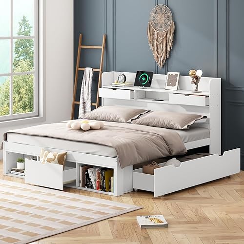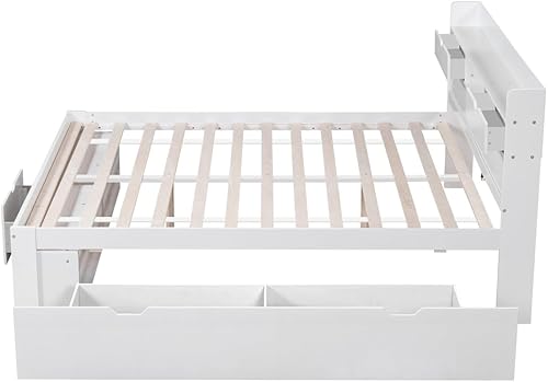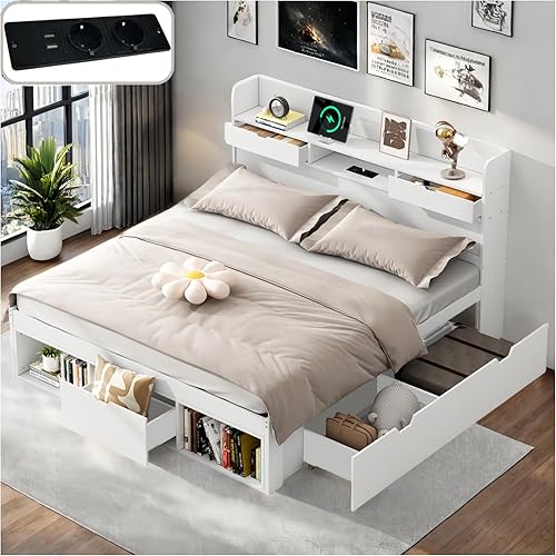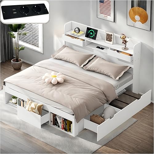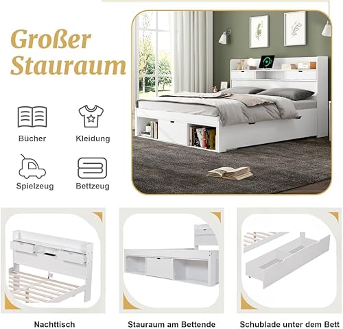 Seyakany Lit 140 x 190 avec sommier,lit 2 Personne avec Port USB,tiroirs et Armoire de Rangement,Cadre de lit 140x190,sans Matelas,Blanc (140x190)