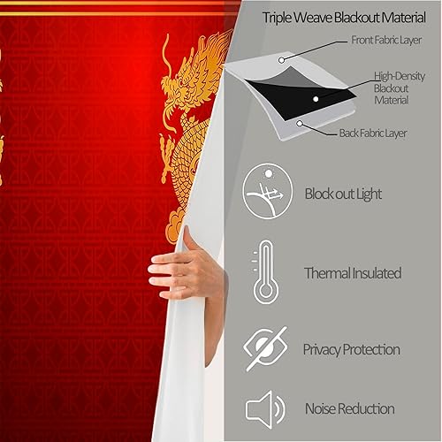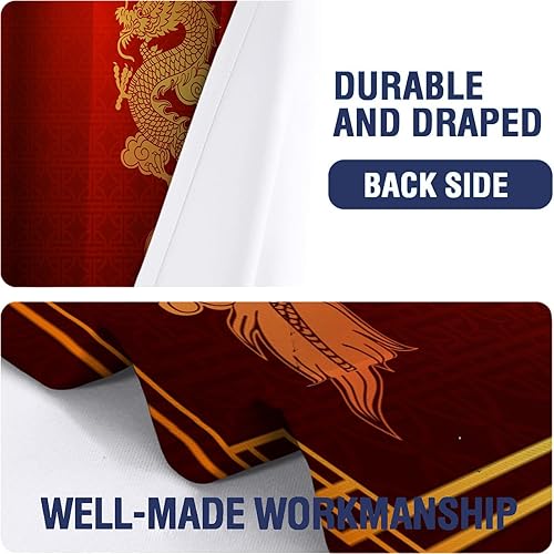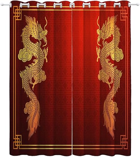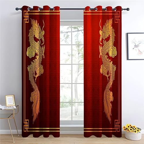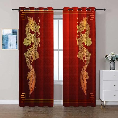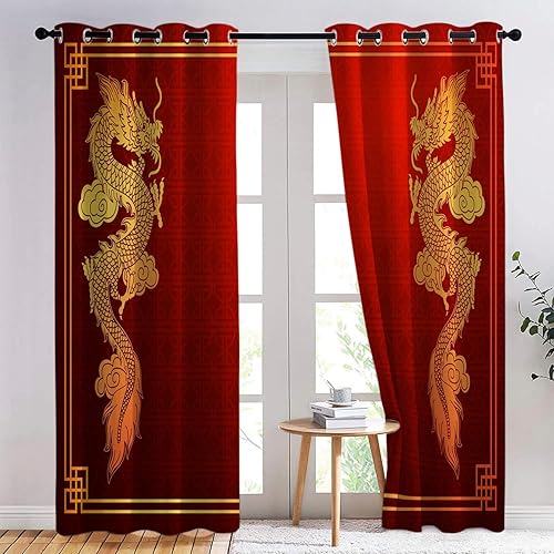YBRAVO Rideaux Occultant 117x137 cm Motif de Dragon Chinois Rouge Lot de 2 Imprimé Rideaux occultants à œillets pour Chambre Salon, Isolant Thermiques Acoustiques Hipster Drapes occultants
