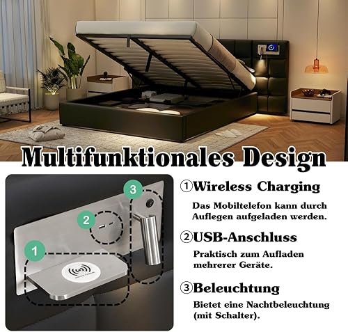 Zubaliya Lit 180x200 avec Sommier LED et LED et USB et Charge sans Fil, Lit Coffre 180x200 avec Rangement, Lit Double avec à Lattes Lit 2 Personnes, Lit Rembourré Cadre de Lit PU(sans Matelas)