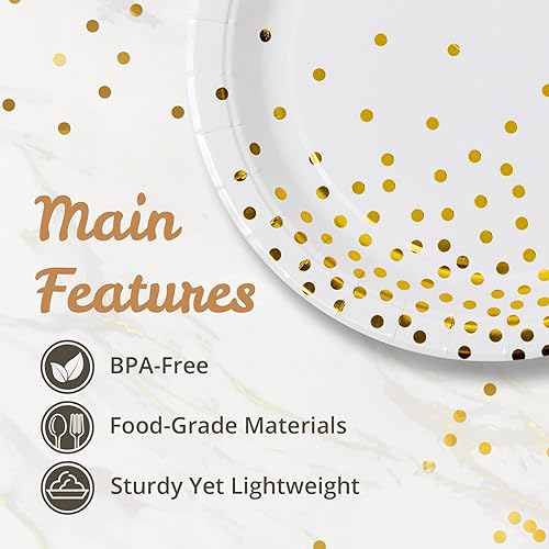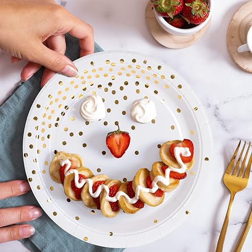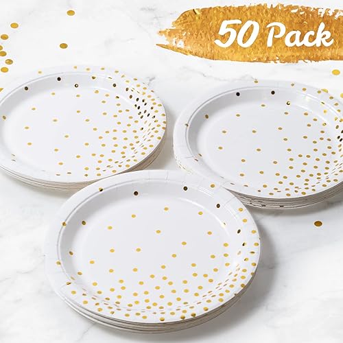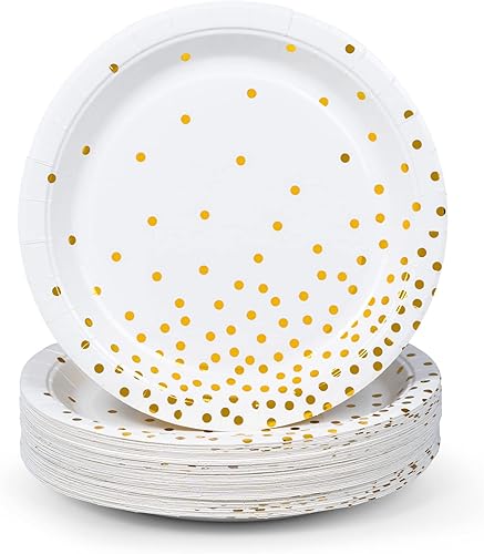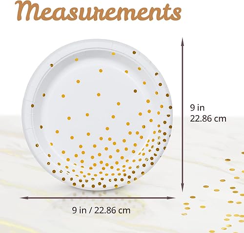 MATICAN Lot de 50 assiettes en carton jetables blanches et dorées, à pois en aluminium, 22,9 cm
