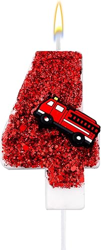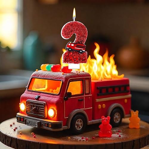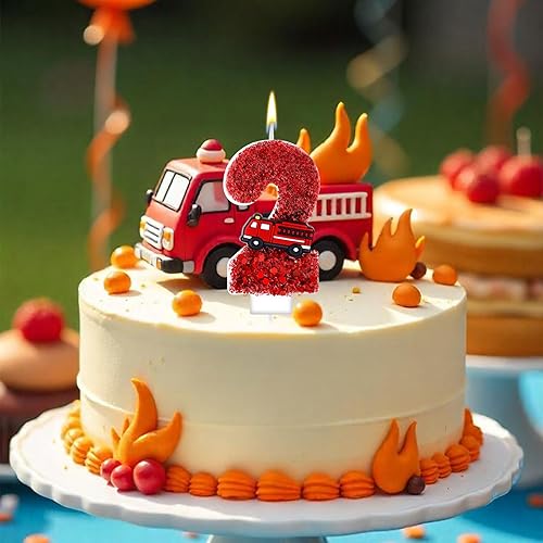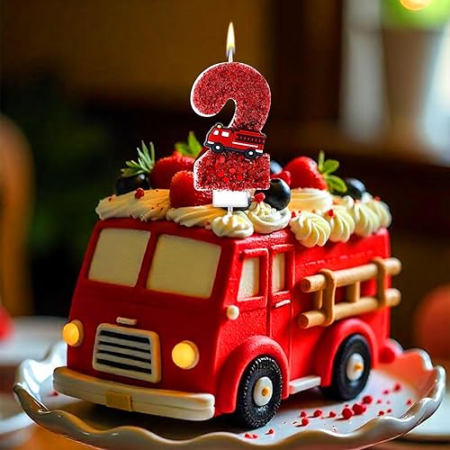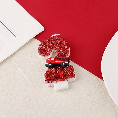Bougie Numéro d'Anniversaire, Paillettes Rouges Camion Pompier Bougie Joyeux Anniversaire Décoration Gâteau Numérique pour Garçons Filles Pompier Anniversaires (2)